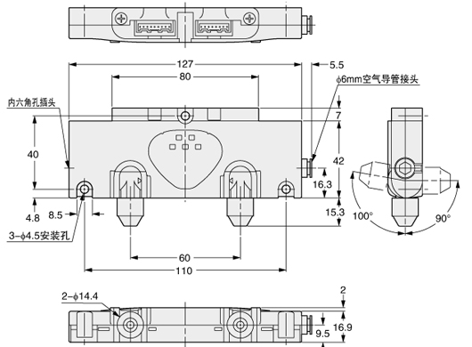 本体厚度仅18.9mm。而且,喷嘴角度可调整,因此可将它们安装在有空间限制的地方。例如,其它设备内或几个相邻产品沿线。 |